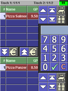 In diesem Bildschirm werden Tische gesplittet, umgesetzt oder zusammengefügt. Über das Eurozeichen gelangt man direkt in den Bezahl/ Rechnungsmodus.
