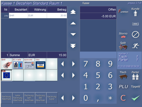 In diesem Schirm wird der Tisch/ Gast abgerechnet. Mischzahlungen, z.B. Bar Kreditkarte sind möglich. Des weiteren können Sie an dieser Stelle eine Zwischenrechnung oder Bewirtungsbeleg drucken. Auch die Kundenzuweisung kann noch an dieser Stelle durchgeführt werden. Alle wichtigen Funktionen wie Tischwechsel |